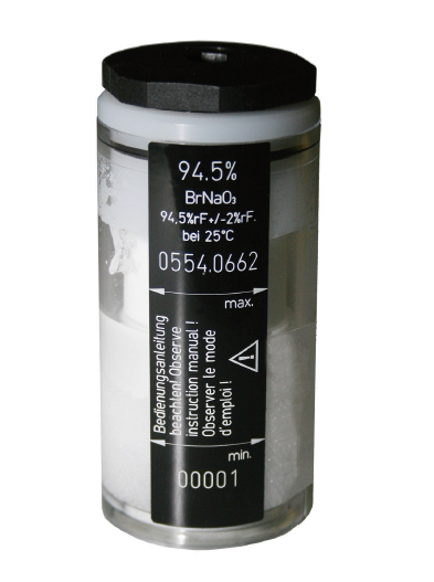 Contents of the testing container and deviation | NaBrO3 solution = 94.5 % RH ± 2.5 % RH |