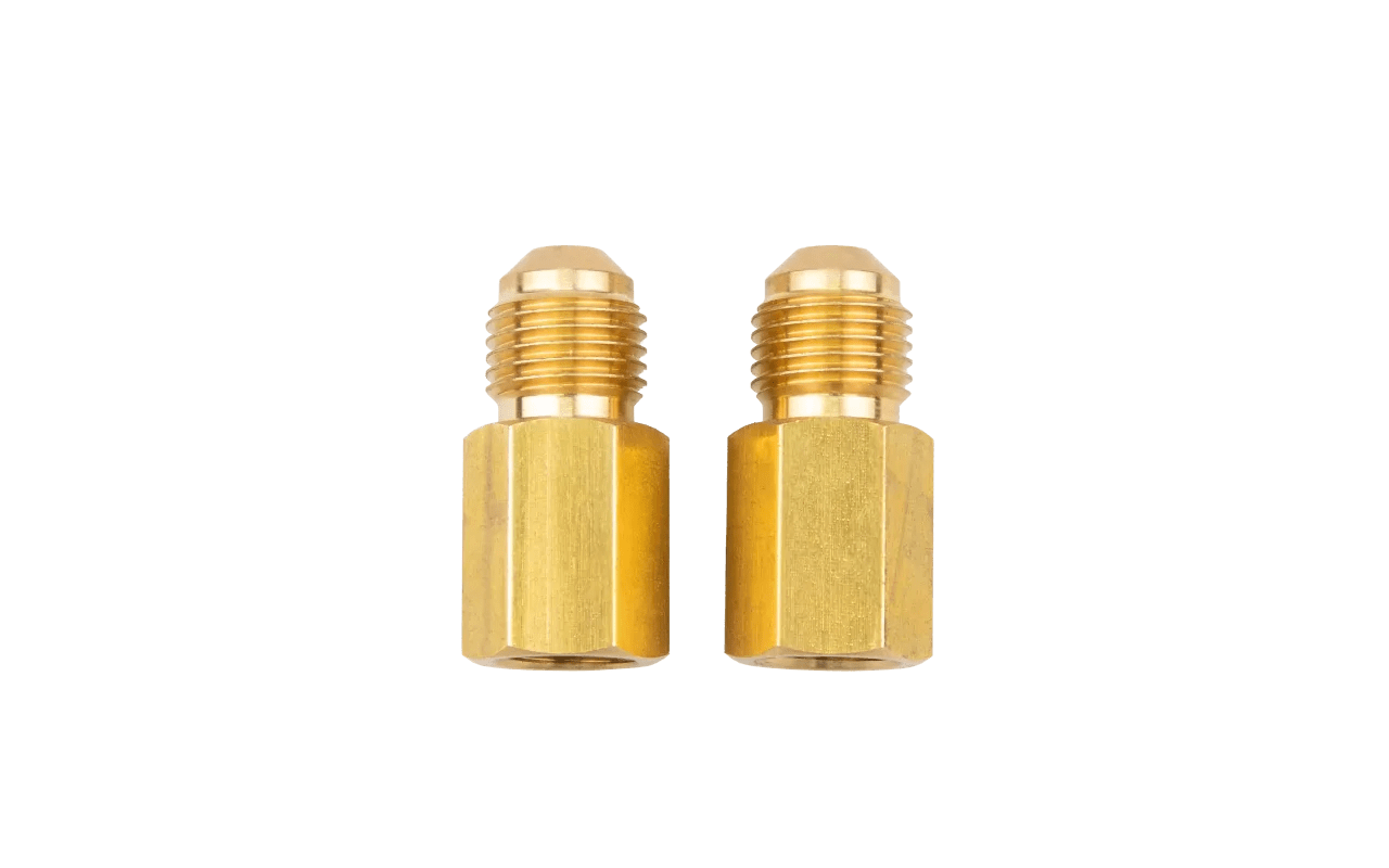 Robust charging hose adapter with 5/16" SAE male thread to 1/4" SAE female thread.