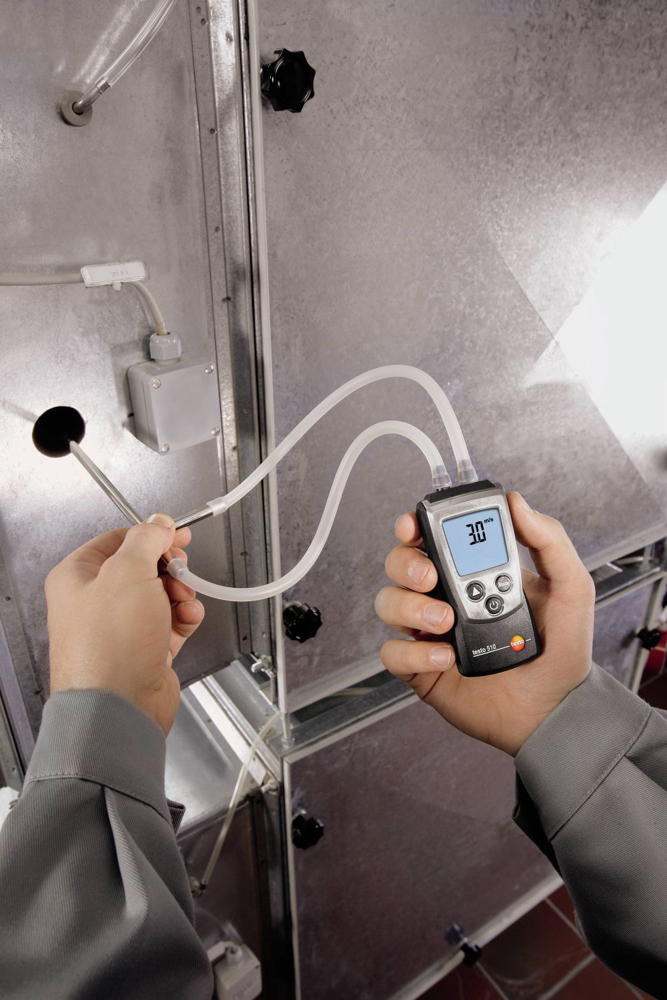 The testo 510, in combination with an optional Pitot tube, measures air flow velocity. For accurate measurement values, the air density can be compensated.