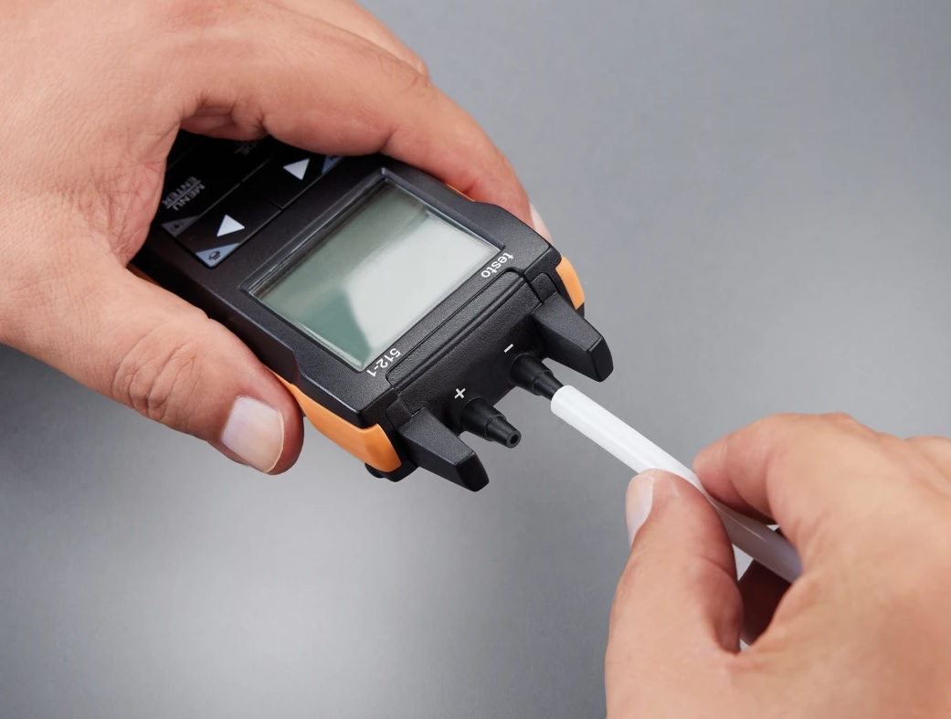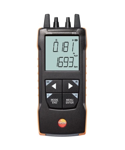 - testo 512-1 with position-independent differential pressure sensor with high accuracy up to 80 inH20 for checking filters and for Pitot tube measurement in the ventilation duct, incl. volume flow calculation in measuring instrument and App