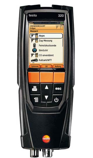 Are you looking for a multi-function instrument for efficient flue gas analysis? Which confidently solves every task on a heating system? And is still convenient to use? The new testo 320 fulfils all of these requirements, because that is exactly what it was developed for. The testo 320 has a high-resolution colour display which presents the measurement results graphically. It provides simple, self-explanatory measurement menus. The testo 320 is very robust, ergonomic, and at the same time aesthetically designed. It has two sensors for O2 and CO as well as a temperature probe integrated into the flue gas probe for the direct measurement of temperature, O2 and CO. From these data, the instrument calculates all relevant flue gas measurement parameters such as CO2 value, degree of effectivity and flue gas loss. Direct draught or pressure measurements are additionally possible. Using the fine pressure probe, the flue draught or gas pressure values can optionally be measured parallel to the flue gas measurement. - TÜV-tested according to EN 50379, Parts 1-3.