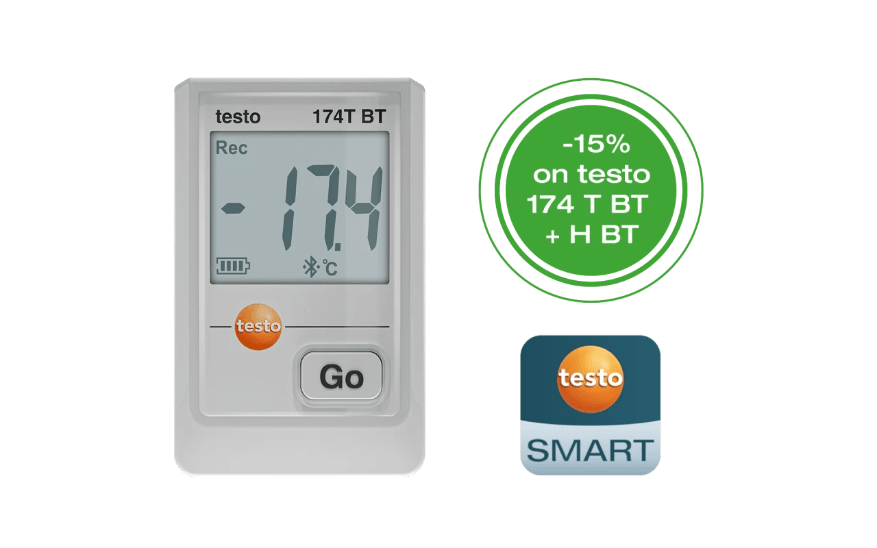 Bluetooth models (174 H BT and 174 T BT) offer convenient operation via the testo Smart App, available for iOS and Android. The app lets you view measurements, create PDF reports, add photos/comments, and email results directly from your smartphone or tablet. These reliable, cost-effective loggers deliver precise data and support compliance with quality assurance standards.