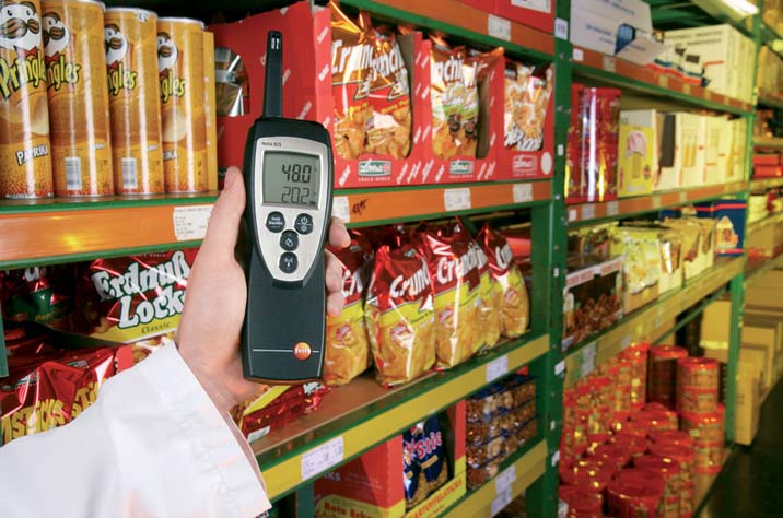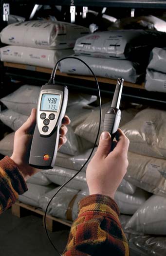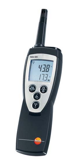 The compact instrument with built-in humidity probe head for measuring air moisture and temperature. The large 2 line display shows humidity, wet bulb temperature or dewpoint as well as temperature. When measuring at hard-to-access points, the humidity probe head can be easily removed and attached to the handle via the probe cable (accessory). Alternatively, the readings can be transmitted wirelessly over wide distances from the probe to the measuring instrument. To do this, the humidity probe head is attached to the radio handle (accessory) and the radio module (accessory) is added to testo 625.