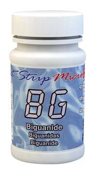 The eXact Micro Test Strip Biguanide comes in a bottle with 50 test strips used in the 638nm eXact® Photometers.