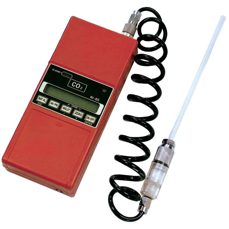 This Model RI-85 is a compact, lightweight portable CO2 monitor with an Infrared (NDIR) type sensor. This sensor provides fast and accurate detection of CO2 levels from 0 to 10,000 ppm. An internal pump is utilized for continual sampling, and the unit operated for 12 hours from one set of batteries. Microprocessor control provides average readings over a selected time period, and also can display the peak value detected.