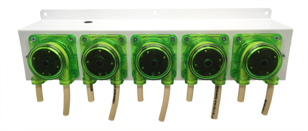 AgrowDose AD5 "penta" peristaltic dosing pump with five independent pump heads for injecting nutrient solutions, pH buffers, chlorine, chemicals, food and beverage mixing, and more. Pump precise volumes of liquids at variable flow rates into reservoirs or pressurized lines (up to 25psi.)