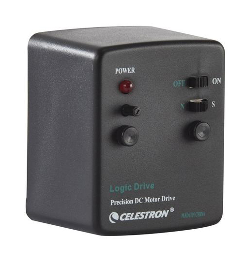 The Celestron single-axis motor drive runs on a 9V battery, so there are no cords to get in the way. The drive can be used in either the Northern or Southern Hemisphere. To change hemispheres (reverse the motor's direction), simply flip the North/South (N/S) switch on the face of the motor drive. It is also simple to change the speed of the motor. A "Speed Rate Regulator" knob is located just under the power indicator, and can be turned in either direction to slow down or speed up the motor. Since solar system objects like the Sun and, Moon move through the sky at different rates than deep-sky objects do, this gives you the ability to match the motor's speed to the particular type of object you are observing.
