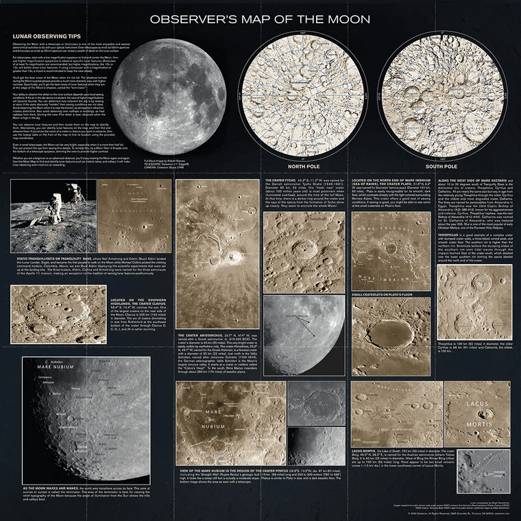 On the reverse side of the map, there are close-up photos and information about the most exciting lunar regions to explore. You'll also find images of the North and South polar regions for reference?. Refer to the lunar observing tips for practical information about using your telescope or binoculars to explore the Moon.