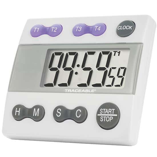 Each channel has a distinctive alarm that sounds for 1 minute, pressing any button will turn off the alarm. Timer memory recalls previous time set. Features time-of-day in 12- or 24-hour formats. Traceable® Products have an individually-numbered Traceable® Certificate provided with each unit, that assures accuracy from our ISO/IEC 17025:2017(1750.01) calibration laboratory accredited by A2LA. It indicates traceability of measurements to the SI units through NIST or other recognized national measurement institutes (NMI) that are signatories to the CIPM Mutual Recognition Agreement. Each product goes through an intense vetting process before it can carry the Traceable name, thus saving you both time and money by not having to calibrate separately.