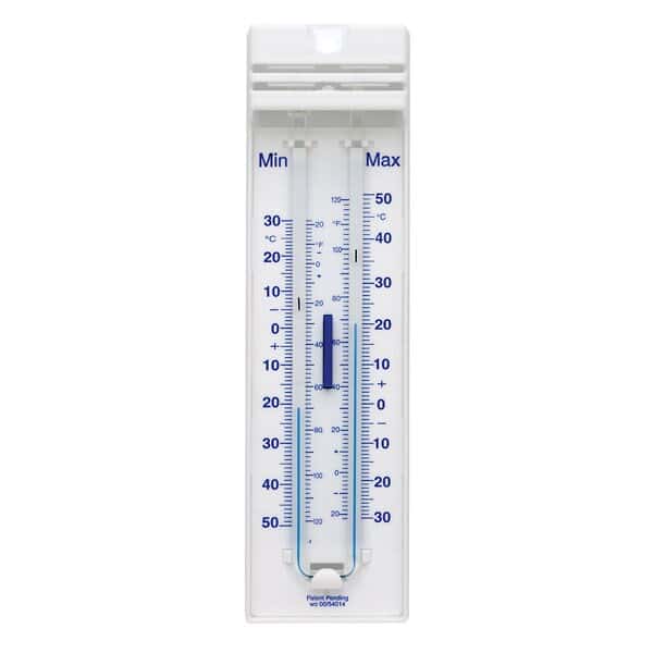 Efficient thermometer measures both minimum and maximum temperatures in Fahrenheit and Celsius scales. Readings are accurate to ±1 scale division. Bulbs are enclosed in a sturdy plastic case suitable for outdoor or indoor use.