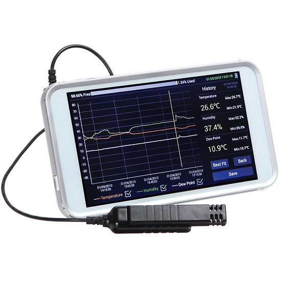 Accurately measure and log temperature, relative humidity, and dew point conditions with this tabletbased instrument. An intuitive touch-screen display makes this recorder easy to use and view. Measured values are simultaneously displayed both graphically and digitally on a high-resolution, color display. Simply touch to program sample frequency, sample size, alarm settings, start mode, and units of measure. Use this invaluable tool in real-time mode or set it to start logging at a future time.