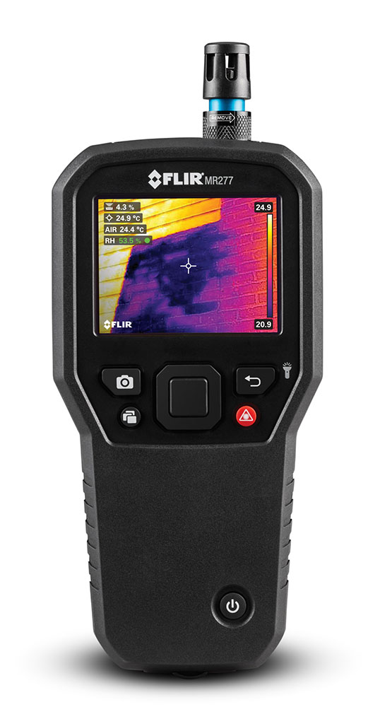 | Packaging contents | FLIR MR277, FLIR MR13 Replaceable Temperature and Relative Humidity Sensor, FLIR MR02 Standard Moisture Pin Probe, quick start guide, international USB charger, USB cable, and lanyard |
