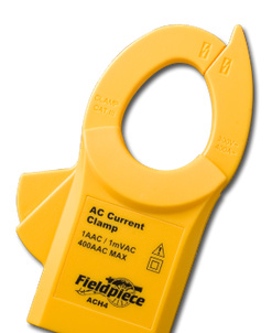 The ACH4 current clamp is a small size accessory head for quickly reading up to 400 AC amps. The claw feature on the clamp makes it easy to quickly pick out the wire you need to measure. Once the current carrying conductor is isolated, the amperage is converted to mVAC for reading directly on the meter. The ACH4 works with the Fieldpiece "Stick" meter, EHDL1 Electronic Handle, EH4W Wireless Handle, DL3 Data Logger, the HG2 and HG3 HVAC Guide® System Analyzers, or any other digital multimeter (with mVAC range) connected by Fieldpiece ADLS2 detachable silicone leads or AHDL1 handle adapter.