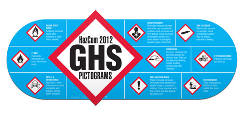 HazCom 2012 GHS Pictogram Wall Chart provides a highly visual review of the new GHS pictograms. Each of the 9 GHS pictograms are listed along with descriptions of the hazards that each pictogram represents.