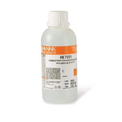 The 1413 µS/cm calibration solution is best suited for general use. This solution is also available in combined kits with HANNA pH 7 buffer for easy calibration of multiparameter instruments.