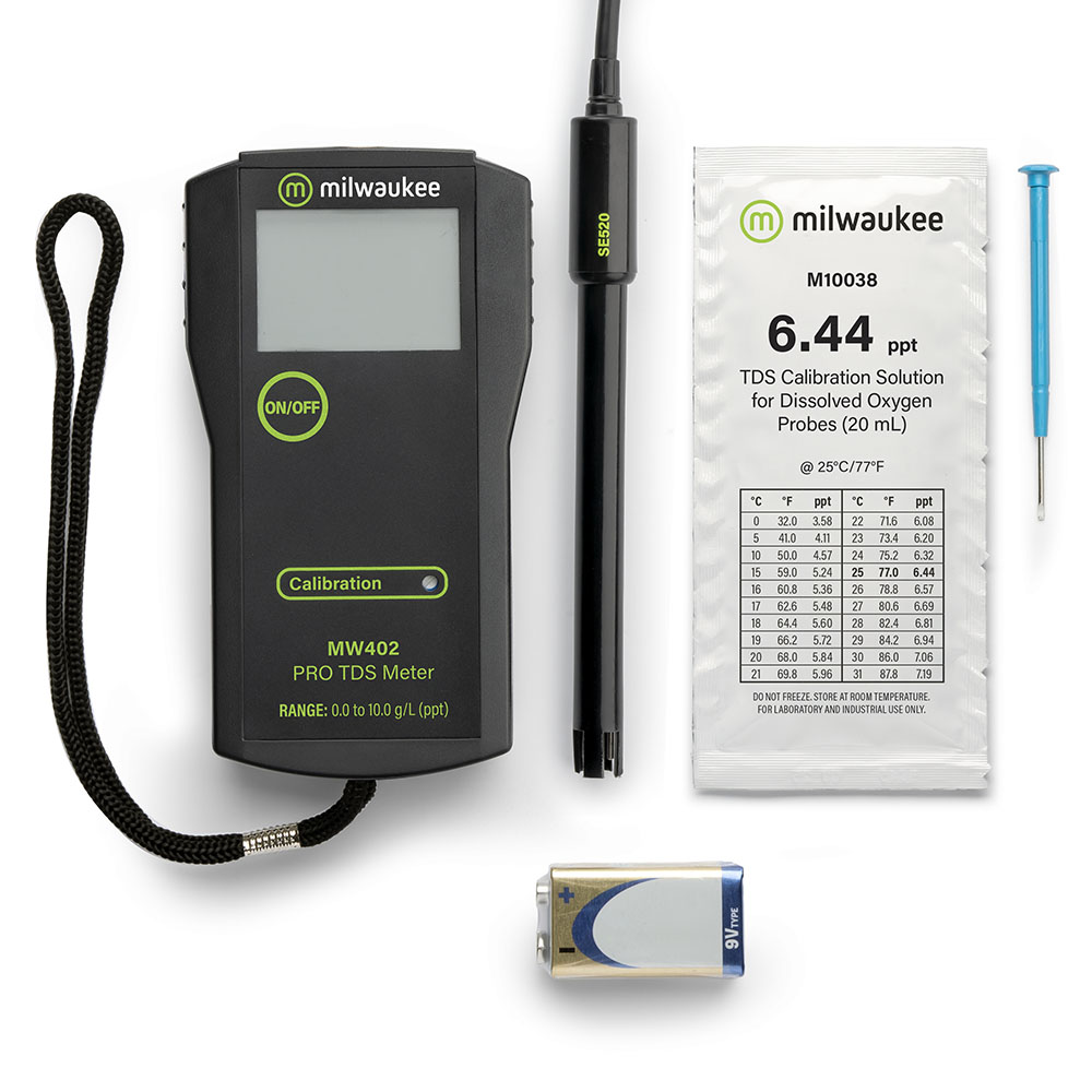 MW402 has a range of 0.0 to 10.0 g/L (ppt) with a 0.1 g/L resolution. The meter is supplied complete with TDS probe with 1 meter cable and calibration solution.