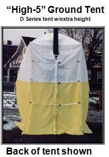 Tent measures 6' x 6' x 8' high. Ideal for use over industrial tripod or davit retrieval hoists. May be used to cover pad or pole mounted cabinets or anywhere that additional height is required. Rear Access 1/2 moon style zipper door included. Door style velcro slit and 8" diameter heater/ventilator hose sleeve.