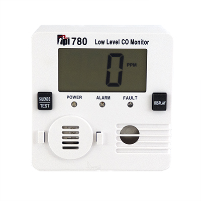 The TPI 780 is a low CO monitor of use in work and living spaces. It can be set on a flat surface or mounted to a wall using the included hardware.