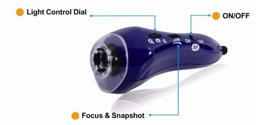 The newly-developed ViTiny UM05 Handheld USB Digital Autofocus Microscope is powered through USB port. It allows you to automatically zoom in up to 320x (on 22" monitor) for any object you want to view. By simply pressing the focus button, you will quickly receive the clearest images by auto-focus, eliminating the need for manual focus. It is convenient and easy to use, has the ability to capture images in high magnifications, take photos, and record videos. The bundled software has useful measurement functions to measure length, angle, and area of objects. Moreover, the far distance control mode in software allows you to control all functions (auto-focus, adjust brightness, take photos, record videos, etc...) without a single button touch on microscope. UM05 is ideal for a variety of applications including textile inspection, detailed repair, printing inspection, computer parts inspection, living creature examination, reading aid, and collectables examination (coins, stamps).